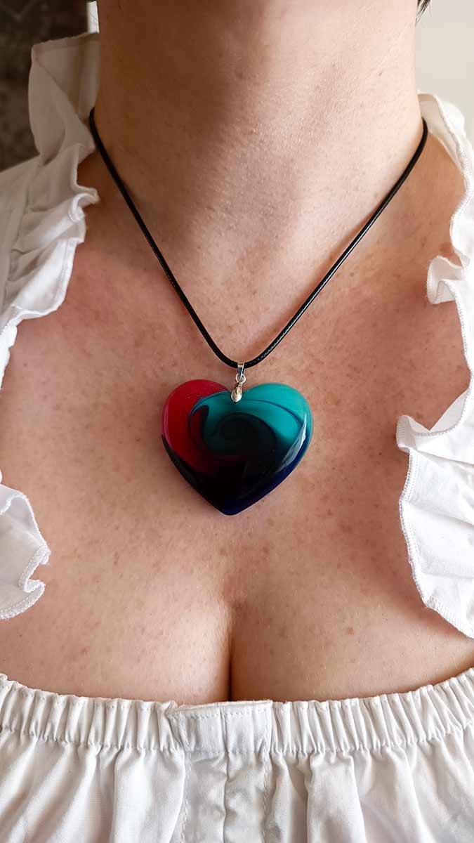 Eine wunderschöne Kette mit Herzanhänger in rot- grün-blau, geswirlt. Die Rückseite ist einfarbig weiß gestaltet, um die Farben noch mehr zur Geltung zu bringen. Der Anhänger ist ca. 5 cm x 4 cm groß. Die Kette ist ein schwarzes Lederband mit verstellbarem Verschluss. In dieser Farbkombination ist es ein absolutes Einzelstück.