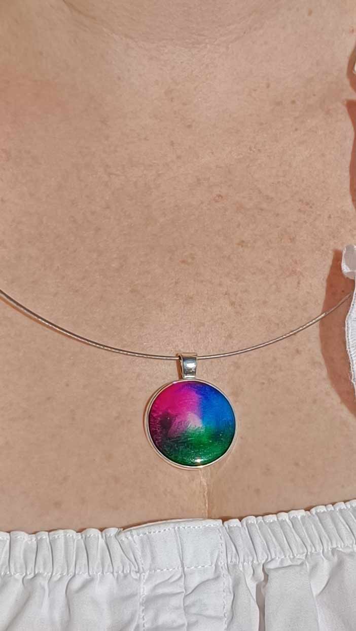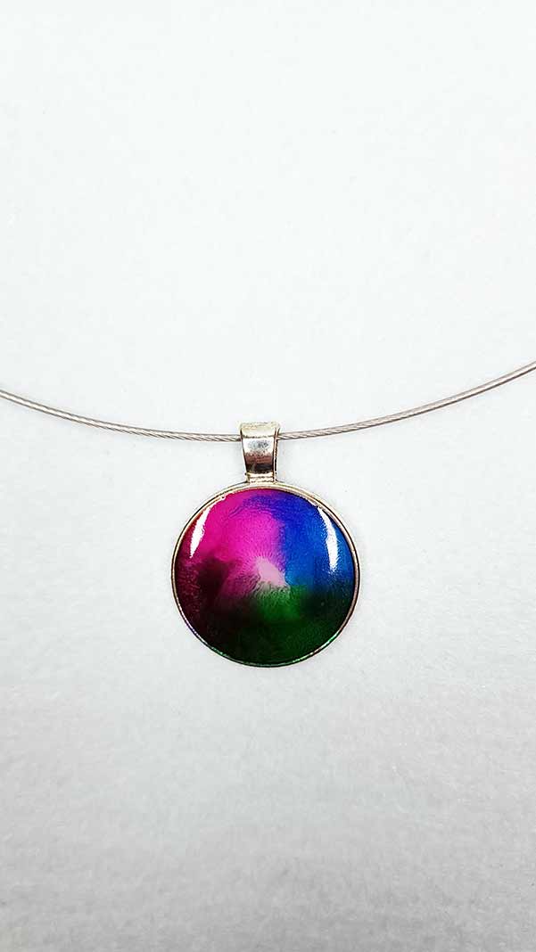 Etwas ganz Besonderes! Diese Kette besticht durch die Einfachheit das Anhängers, der in den 3 Farben (Purple, Blau und Grün) farbverlaufend eingegossen wurde. Das dazu passende Drahtband hat einen Drehverschluss und ist silberfarben mit einer Länge von ca. 60 cm. Der runde silberfarbene Anhänger hat einen Durchmesser von ca. 2,5 cm.