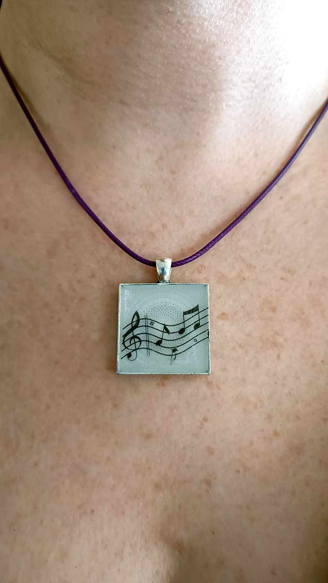 Diese Kette für den Musikfreund unter Euch ist schon allein deswegen etwas Besonderes durch die quadratische Form des Anhängers. In ihm ist eine Notenreihe in schwarz auf irisierendem hellen Grund. Das passende Band ist lilafarben und ca. 42 cm lang ( am Verschluss ist die Länge noch zusätzlich erweiterbar). Der Anhänger ist silberfarben und ca. 2,5 cm.