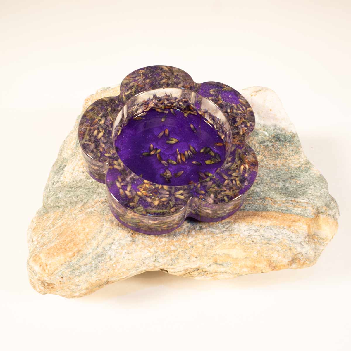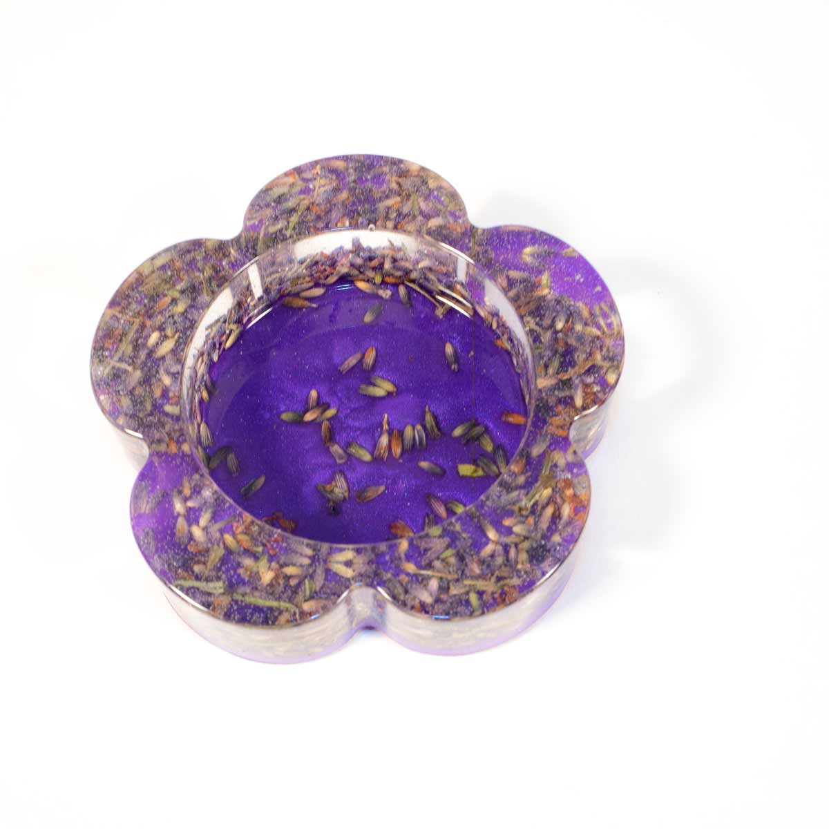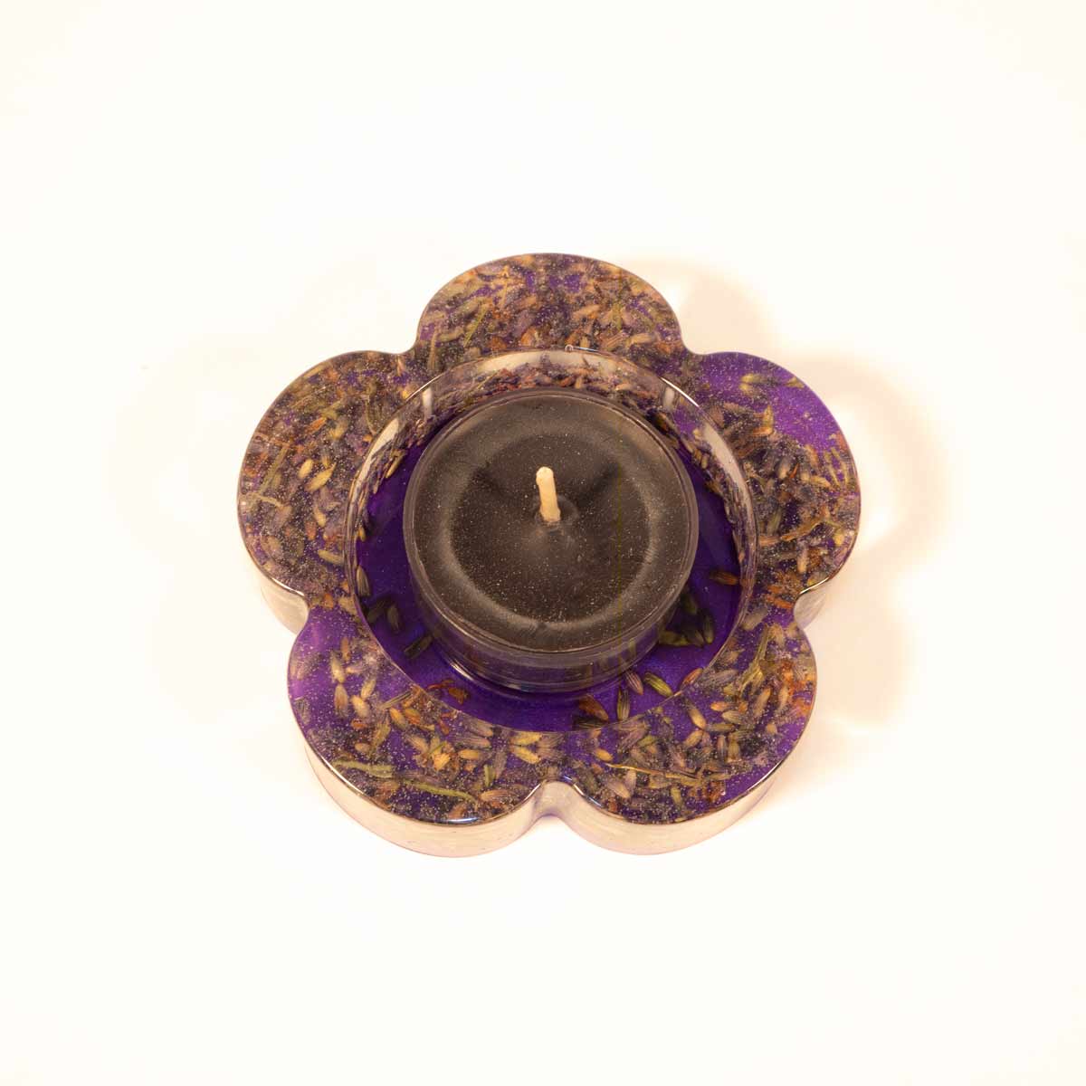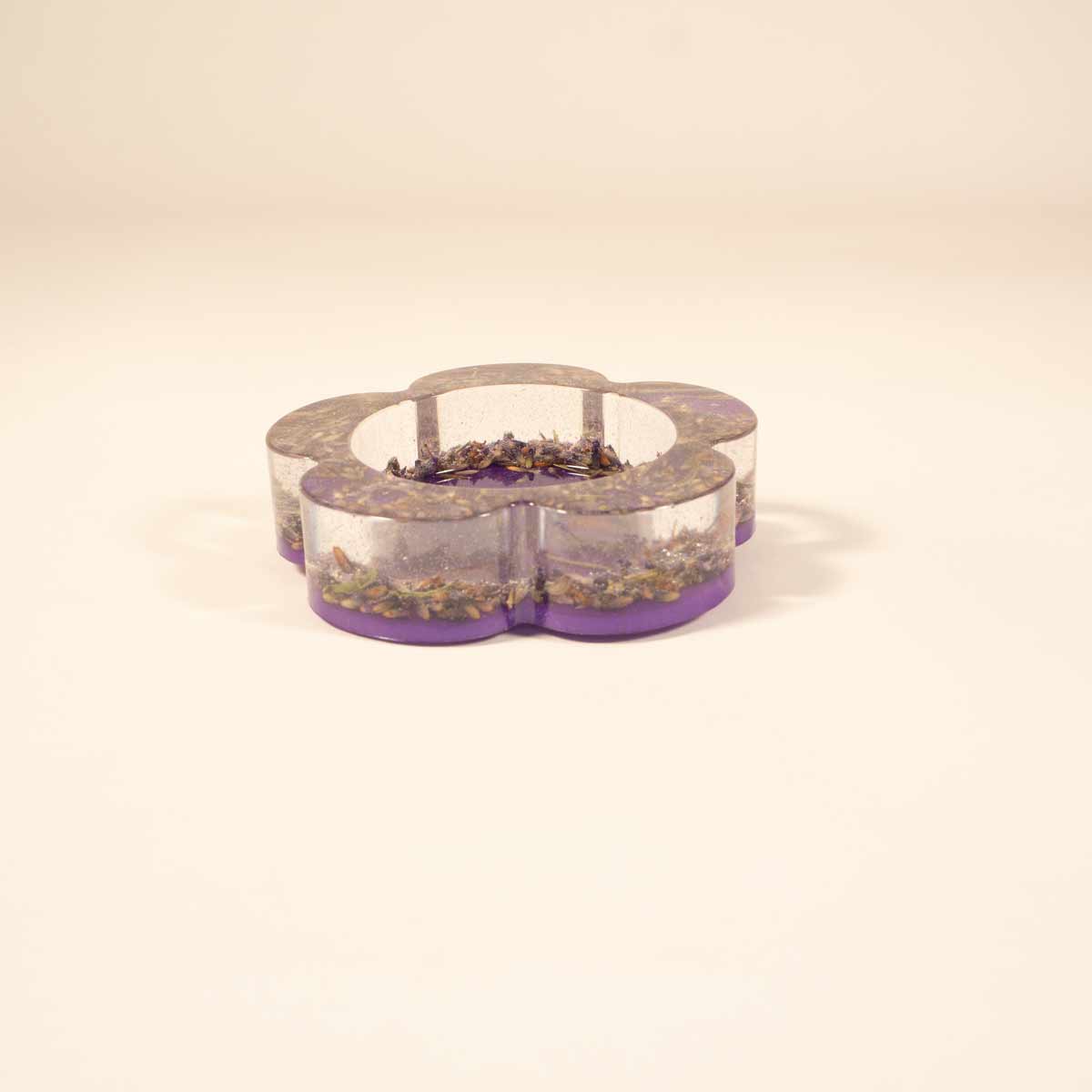 Ein hübscher blumenförmiger Teelichthalter in klar eingegossenem Resin mit Lavendelblüten und einem Untergrund in dazu passendem lila.